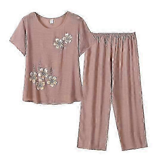 2 Pcs/Set Women Top Pants Set O Neck Flower Print Grandma Style Elastic Waists Summer Pajamas Set for Daily Wear