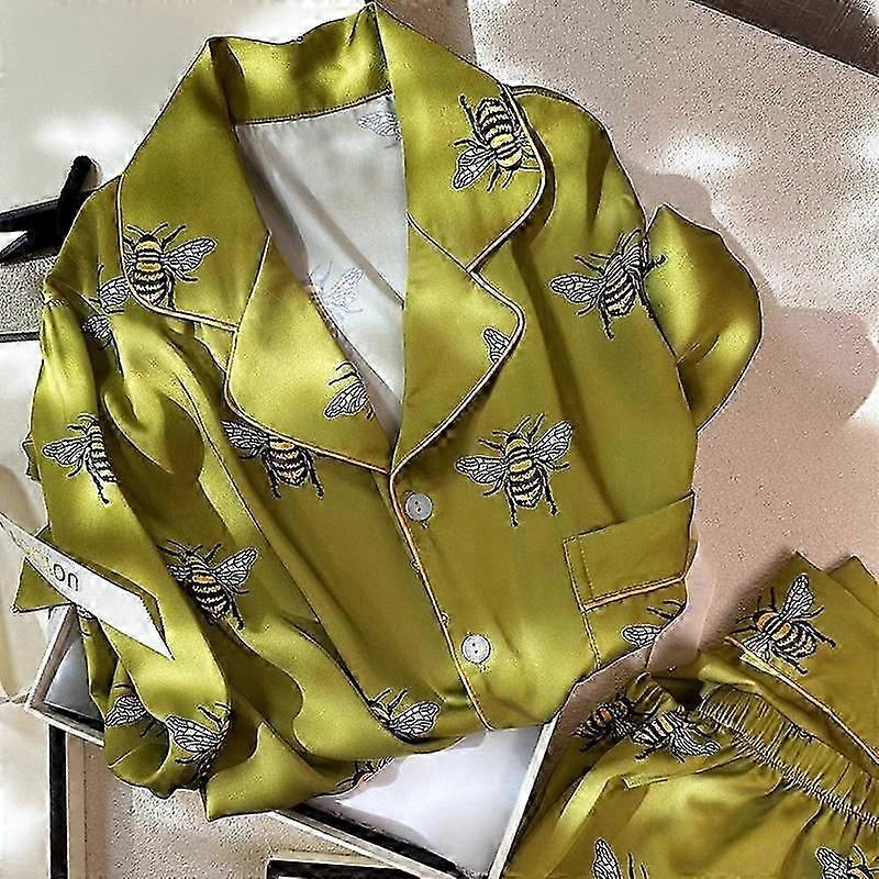 Women's Pajama Set Spring Autumn Two Piece Bee Print Pyjama Pocket Faux Silk Satin Sleepwear Long Sleeve Pijama Mujer Pjs Homewear
