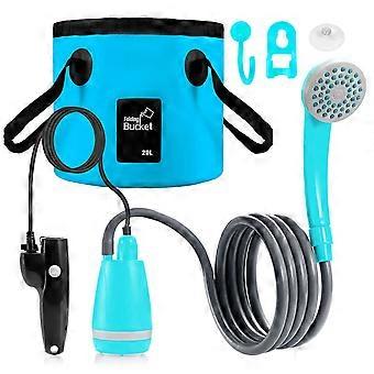 Features1High-Powered Motor: Ensures a large water discharge of 2.5-3.5L per minute for a satisfying shower experience. 2USB Charging: Conveniently charge the shower kit using a power bank or phone charger. 3Easy Setup: Comes with a stand, a spray head hook, and a power hook for easy setup. 4Long Battery Life: Provides 30-60 minutes of operation when fully charged. 5Comprehensive Kit: Includes everything you need for a refreshing outdoor shower.SpecificationExperience the luxury of a refreshing shower in the great outdoors with our Outdoor Portable Camping Shower Kit. This kit includes a 20L water bucket, a 2-meter soft water hose, a high-powered motor, and a USB charging cable. The motor provides a large water discharge of 2.5-3.5L per minute, ensuring a satisfying shower experience. The shower kit is easy to set up and use, making it a must-have for your camping adventures.Features:High-Powered Motor: Ensures a large water discharge of 2.5-3.5L per minute for a satisfying shower experience.USB Charging: Conveniently charge the shower kit using a power bank or phone charger.Easy Setup: Comes with a stand, a spray head hook, and a power hook for easy setup.Long Battery Life: Provides 30-60 minutes of operation when fully charged.Comprehensive Kit: Includes everything you need for a refreshing outdoor shower.Specifications:Color: Blue / Orange OptionalHose Length: 2m / 78.7inHose Diameter: 1.5cm / 0.6inWire Length: 2m / 78.7inWater Bucket Capacity: 20LCharging Method: USBWater Discharge: 2.5-3.5L/minBattery Model: 18650Voltage: 3.7VCapacity: 2200mAhShower without water bucketPackage Size: 25.5x20x7 cm / 10x7.9x2.8 inWeight: 800g / 1.76lb per setShower with water bucketPackage Size : 25.5x20x7 cm / 10x7.9x2.8 inWeight 1000g / 2.2lb per setPackage List:1 x Soft Water Hose (2m)1 x Power Switch Box1 x USB Charging Cable1 x Spray Head1 x Spray Head Hook1 x Stand1 x Transparent Suction Cup1 x Power Hook1 x Color Instruction Manual1 x 20L Water BucketPackage List1 x Soft Water Hose (2m)1 x Power Switch Box1 x USB Charging Cable1 x Spray Head1 x Spray Head Hook1 x Stand1 x Transparent Suction Cup1 x Power Hook1 x Color Instruction Manual1 x 20L Water Bucket