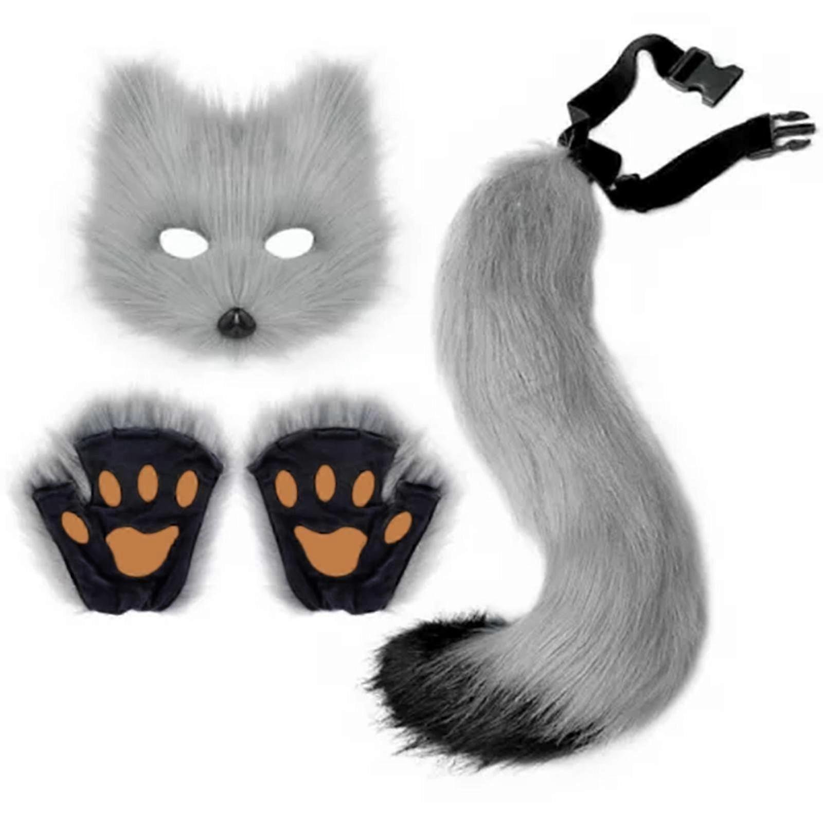 Cute Faux Fur Fox Tail Cat Wolf Cosplay Costume Set Plush Mask Fluffy Paw Gloves New