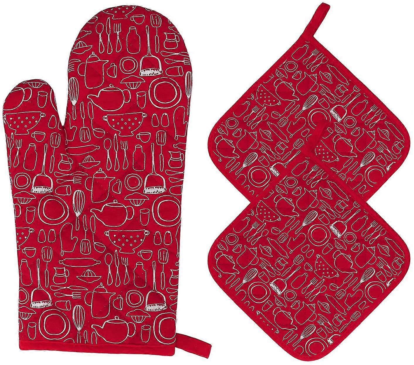 Oven Gloves and Pot Holder Set, Heat Resistant 1 Pot Gloves and 2 Pot Holders for Kitchen Cooking Baking BBQ Grilling Red