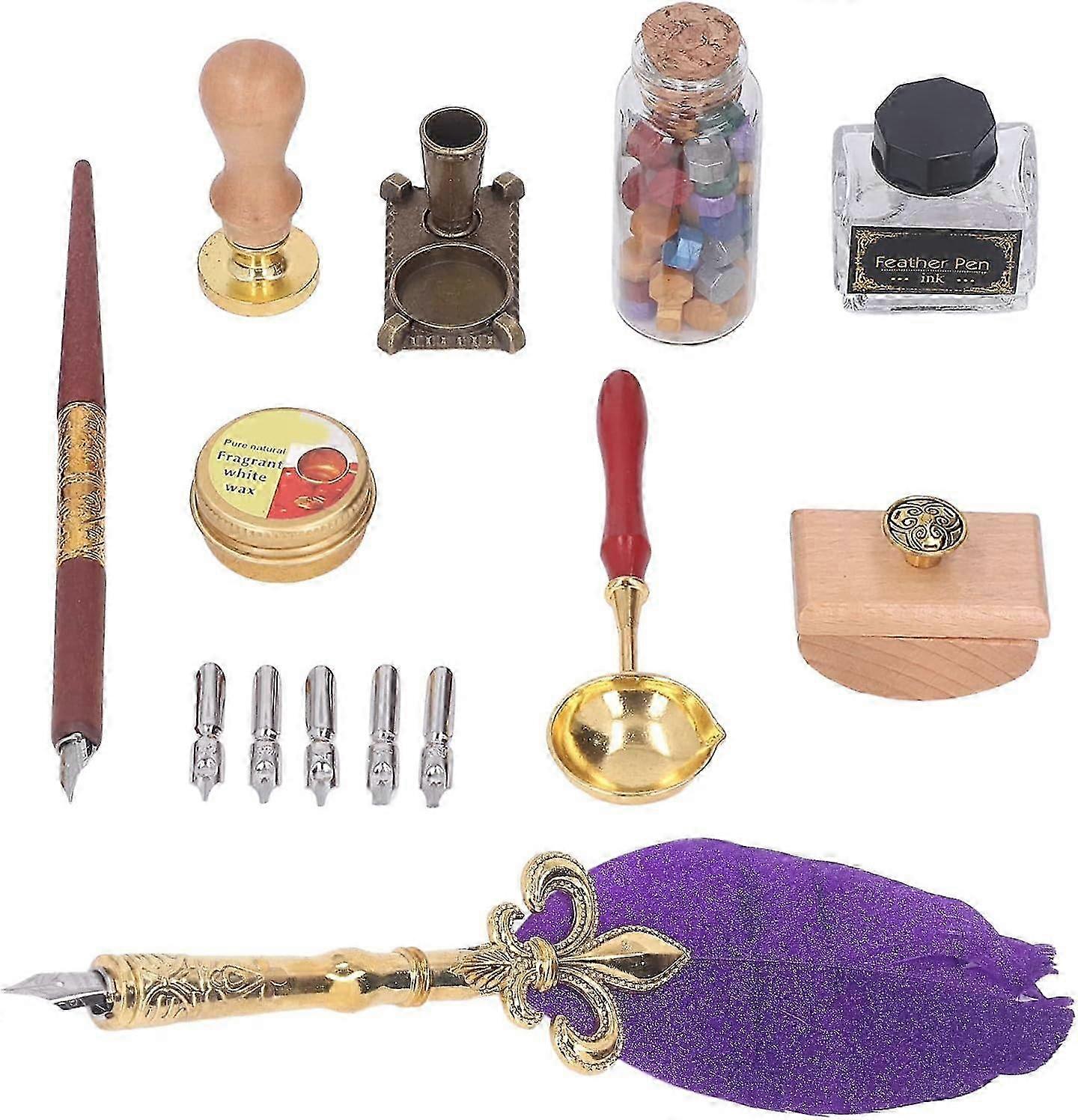 Quill Pen Kit, Replaceable Refill Smoothing Inking Feather Pen Set Retro Exquisite Blotting Stamp for Holiday Gift (Purple)