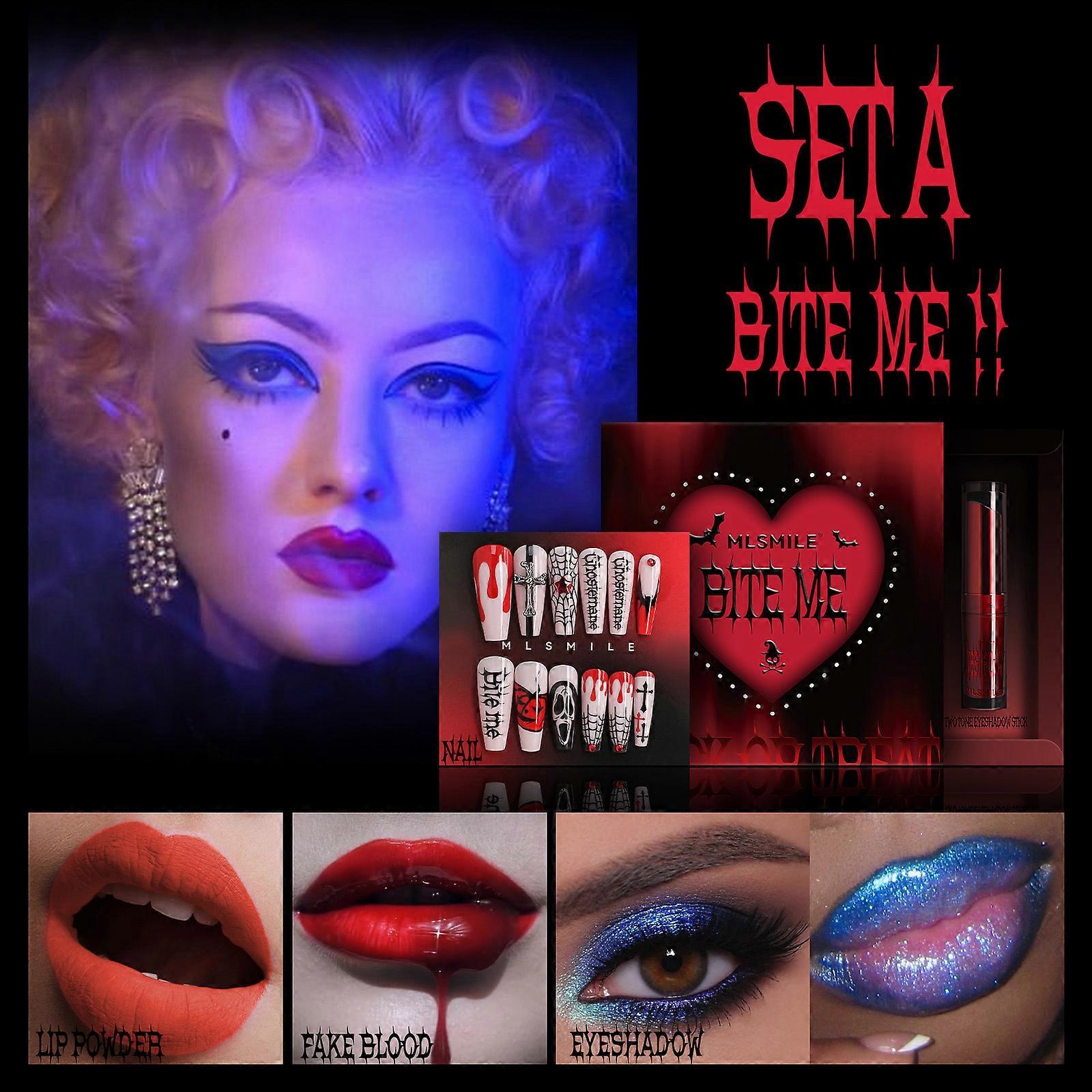 Halloween Makeup Kit, Matte Soft Mist Lipstick, Halloween Wear Press On Nail, Fake Blood Two Tone Eyeshadow Daring Makeup Set Halloween Party Supplies