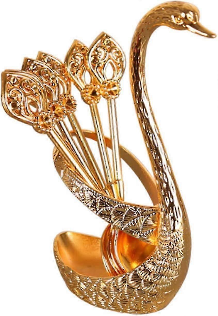 6-Piece Swan-Shaped Coffee Spoons Set with Holder, Vintage Gold Dessert Teaspoons Cutlery with Stand