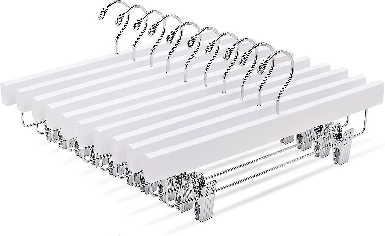Set of 10 White Wooden Hangers 35.5cm, for Pants Skirts Socks Underwear, Non-Slip Hanger with Clips