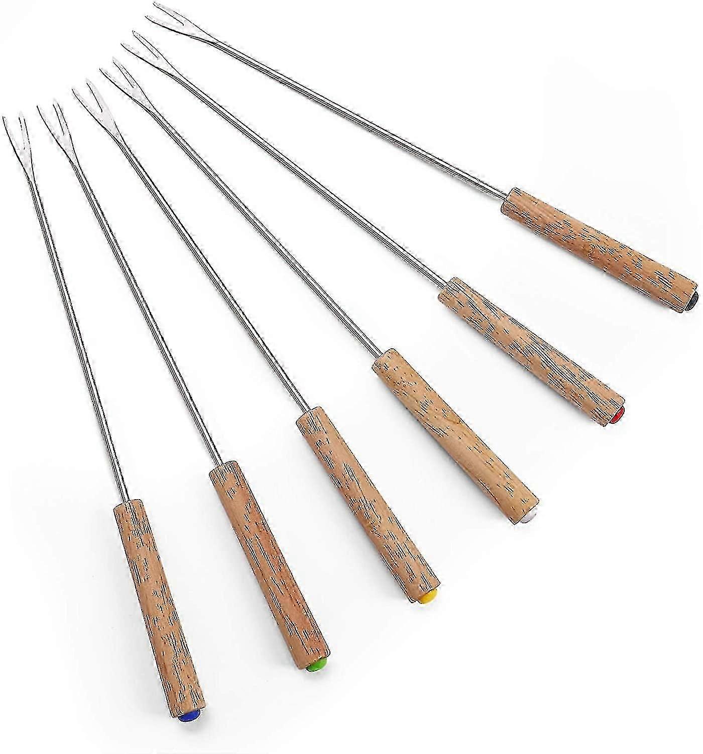 Set Of 6 Stainless Steel Fondue Forks With Wooden Handle Heat Resistant 24cm
