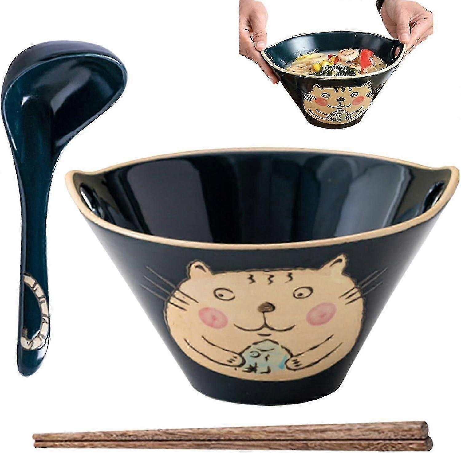 Japanese Cat Design Ceramic Ramen Bowl Set, 27OZ Microwave & Dishwasher Safe with Chopsticks & Spoon