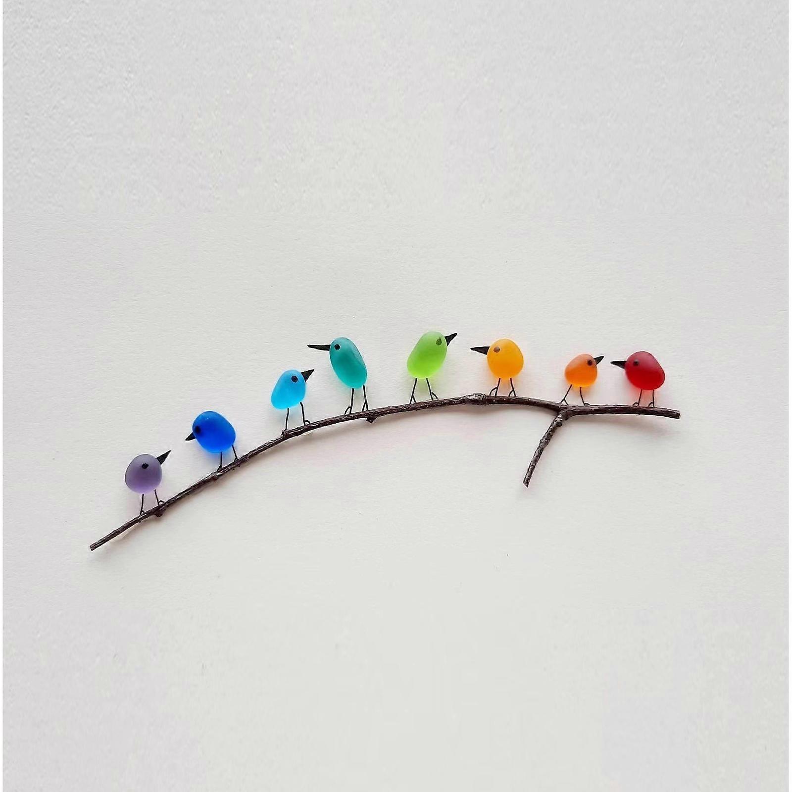 Sea Glass Rainbow Birds, Sea Glass Art, Rainbow Bird Wall Decor, Natural Sea Glass & Driftwood Picture, Framed Unique Handmade Wall Art