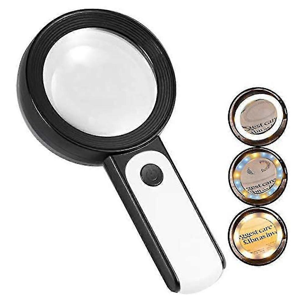 Product descriptionMaterial: ABS frame, glass lensSize: 205 * 103 * 24mmProduct diameter: 80mm (inner diameter) 103mm (outer diameter)Color: black and white, gray and whiteQuantity: 1 piecePackage content: 1 * reading magnifier for the elderly with cold and warm light1. LED lights and 3 lighting modes: The magnifying glass with Led light lights is equipped with energy-saving LED lights that provide good lighting even in poor lighting conditions and make it more convenient to use. At the same time, the magnifying glass with light has 3 lighting modes that can be switched manually under different lighting conditions as required to better protect your eyes.2. High resolution: The magnifying glass with light has a 30-fold purely optical glass lens with which smaller objects can be identified and excellent high-resolution images and texts can be provided. In addition, the robust, scratch-resistant lens of the magnifying glass can be used for a long time. At the same time, the magnifying glass with light comes with lens cleaning paper that can be used to wipe the lens to keep the lens in a bright and clean environment.3. One-button operation: The magnifying glass with light has one button. You can set the light mode and then turn it on and off using the button. When you use the magnifying glass, all you need to do is insert 3 AAA batteries (not included), which is convenient and quick. Note: Please insert the battery with the correct polarity. If it still cannot be used after inserting it, reinsert the battery correctly.4. Unique Design: This magnifying glass with light has ergonomic design, comfortable feeling and lighting equipment, which is suitable for the elderly and children. The black and white appearance of the magnifying glass says goodbye to the limitations of the same color and is more beautiful. The hand magnifier with reading magnifier has a diameter of 80mm (inner diameter) 103mm (outer diameter) and offers a wide field of vision. At the same time, the magnifying glass with light is made of ABS and elastic material, which is more durable.5. Premium: The magnifying glass with light is suitable for elderly people to read. Older people use it to read newspapers, read various manuals, etc. If you do not have reading glasses, you can use a reading magnifier to display small pictures and text. At the same time, the magnifying glass with light is suitable for children and professionals. It can be used to observe small animals, identify jewelry, and inspect crafts.