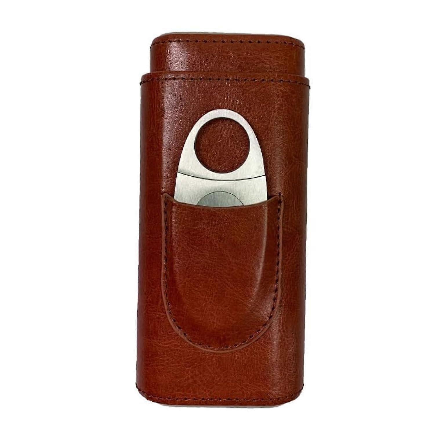 Cigar Humidor Case Premium 3-Finger Genuine Leather Cedar Wood Lined With Stainless Steel Cutter Travel Size Brown