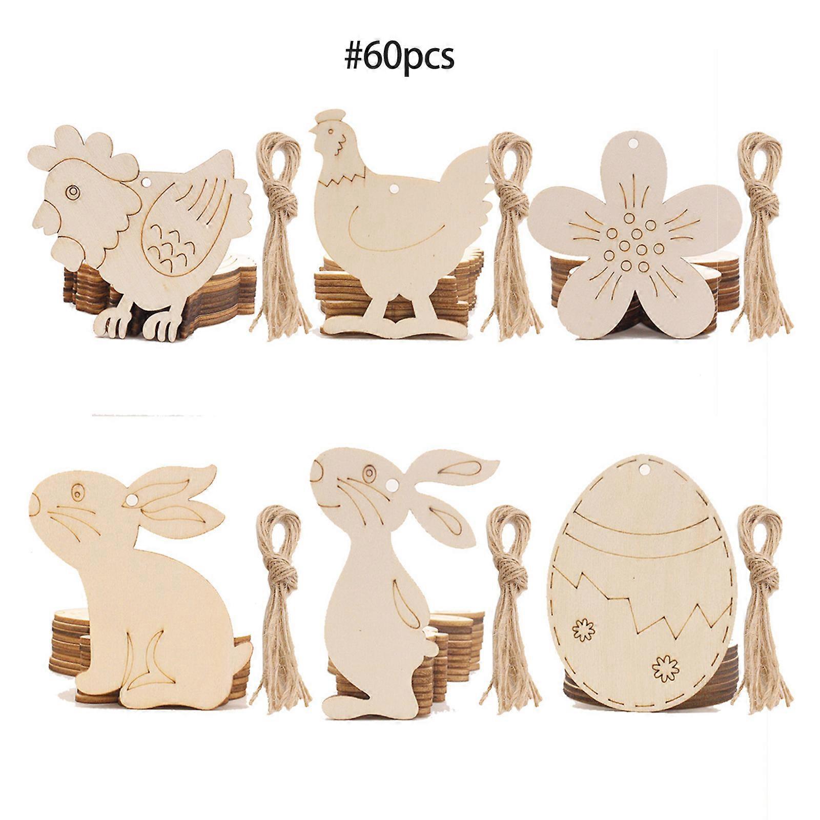 Easter Wood Chips Ornament 60 Pcs Unfinished Wooden Egg Bunny Pendant for Kindergarten Colorful Painted DIY Crafts
