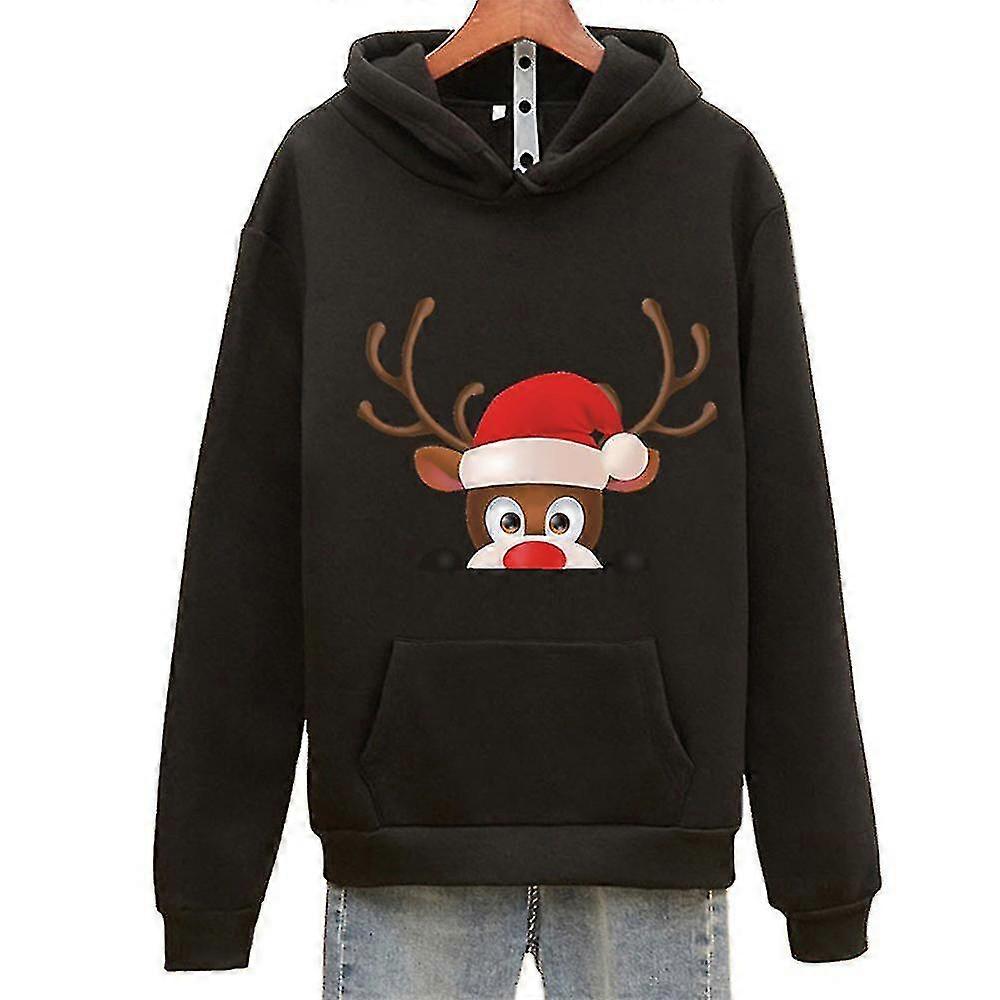 Christmas Women Men Elk Printed Couple Hoodie Long Sleeve Hooded Xmas Sweatshirt Pullover Tops-black