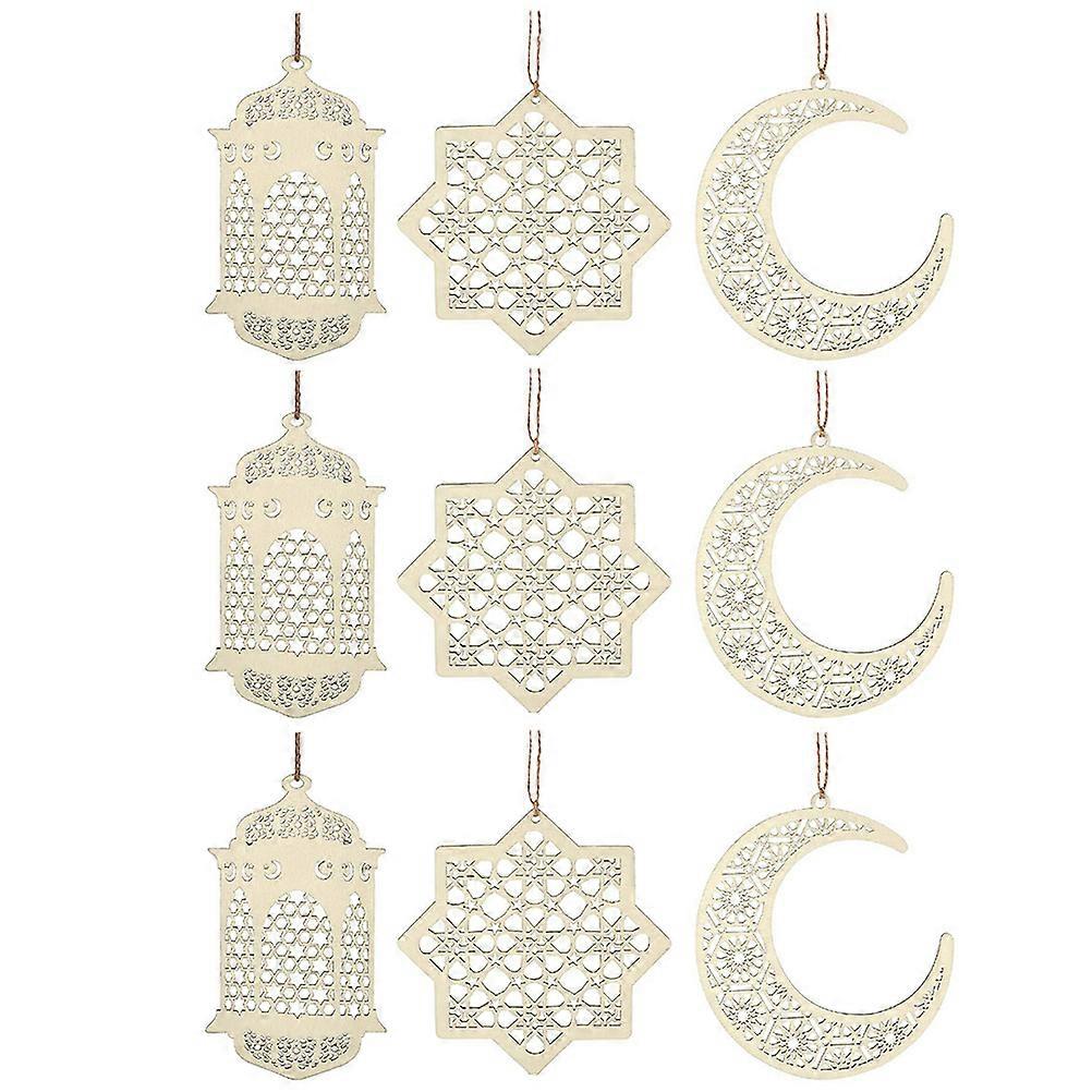 Eid Mubarak Wood Hanging 9Pcs For Eid Festival Light Yellow Hollow Design Decoration