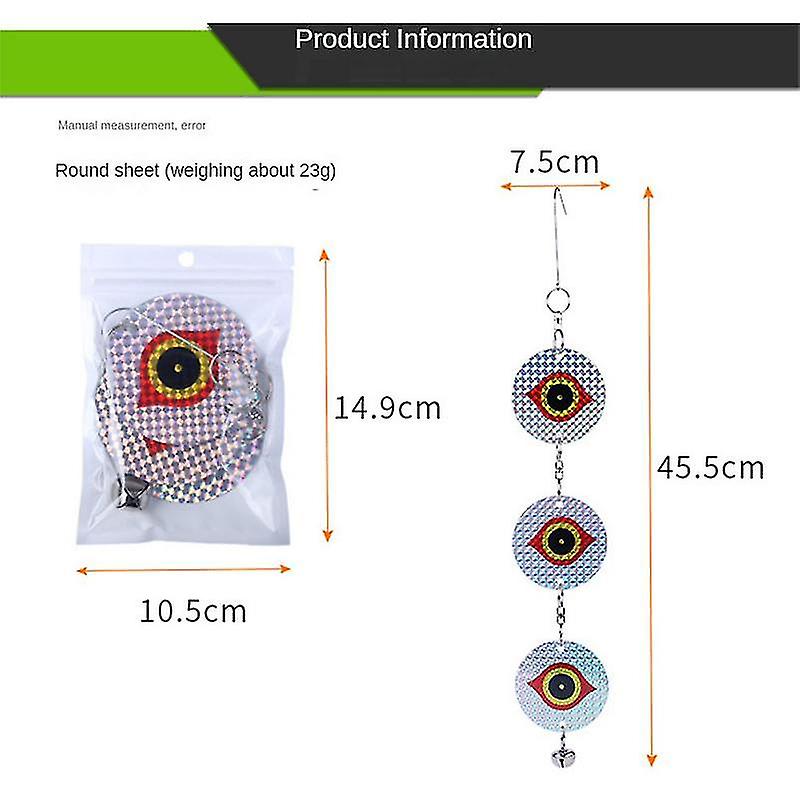 Owl Eyes Double-sided Laser Smooth Edges Laser Bird Repellent Film Bird Repellent Bird Scarer Insect Repellent Pests Scary Birds Product name: laser bird repellent tablets Material: PET Style: two styles can choose Product size: round: disc diameter 7.5cm, hanging length 45.5cm; Diamond: single width 8.5cm, hanging length 56.5cm Net weight: round: 23g; Diamond: 23.4g Specifications: 1. Double-sided laser, strong reflection can rotate with the wind, increase the reflective surface 2. Based on the use of demand, to make more realistic products 3. Thickened PET, smooth edge, not easy to fade 4. Stainless steel accessories, flexible rotation with the wind 5. Big bell, the wind moves, the bell rings, can frighten birds Package Included: 1 * Hanging Sheet