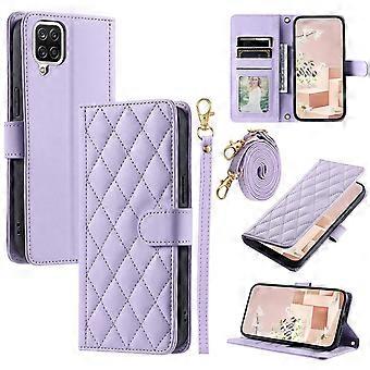 For Samsung Galaxy A12 Case Leather Wallet Flip Phone Cover with Shoulder Strap - Purple GGZGVCrafted with precision using rhombus-pattern stitching on the surface for a stylish lookDual-sided magnetic clasp, not block any vision when using stand functionFeatures an interior coin pocket, three card slots (including one for photos), and comes with a matching wrist strapProvides comprehensive protection for your phone, ensuring it stays safe from all anglesDesigned with precise openings for easy access to all ports and functionsCan also double as a convenient stand for hands-free useWith a hand strap and a 145cm shoulder strap, carry the phone convenientlyCompatible with:Galaxy A12Package included:1 x Leather Case1 x Hand Strap1 x Shoulder StrapAccessory only, phone