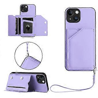 غطاء حافظات لحافظة iPhone 15 حامل بطاقة مسند غطاء هاتف يعمل بلمس الجلد مع حزام معصم - أرجواني فاتح