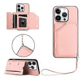 غطاء حافظات لهاتف iPhone 16 Pro حامل بطاقة مسند غطاء هاتف يعمل بلمس الجلد مع حزام معصم - وردي