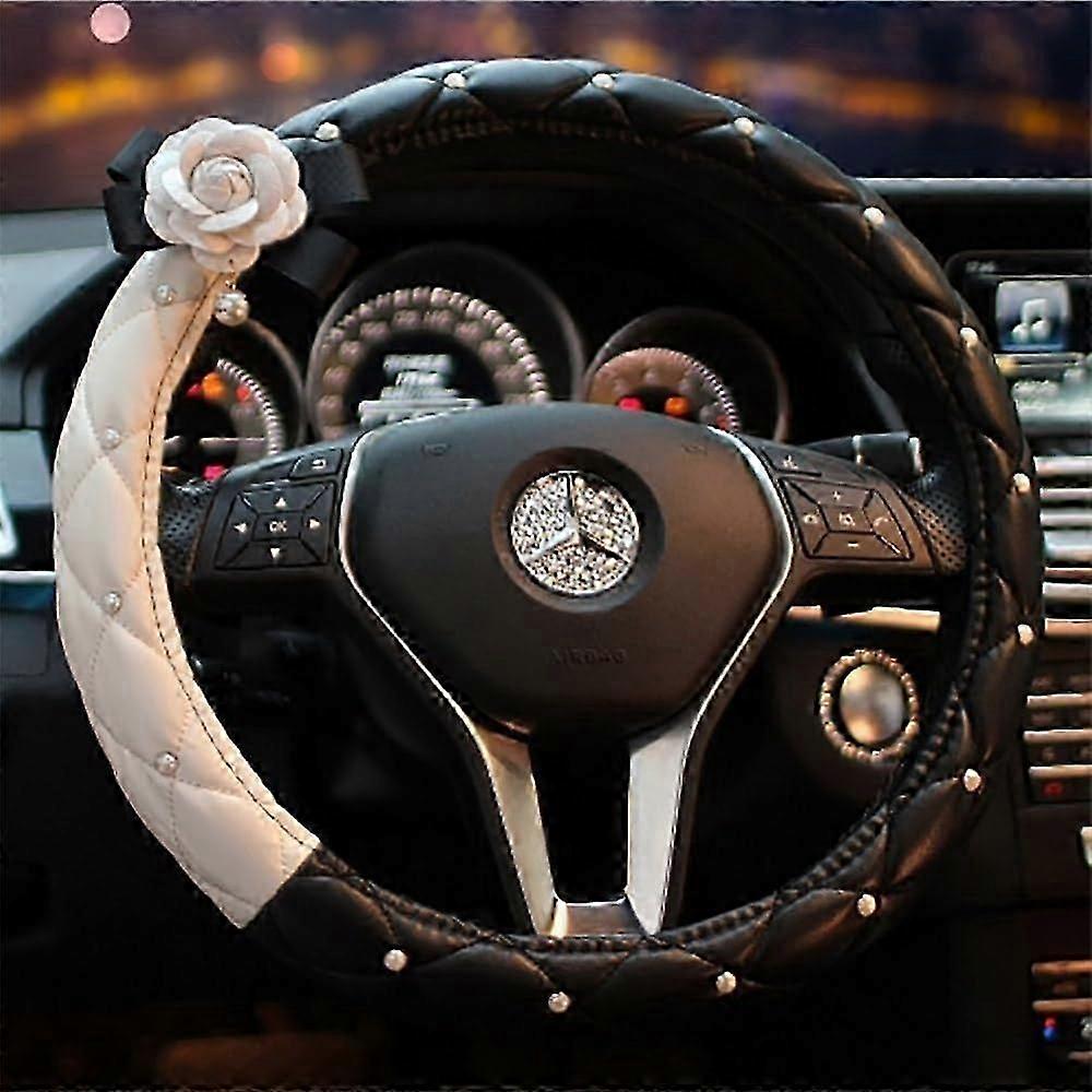 Car Steering Wheel Cover Women's Fashion Camellia Diamond Pearl Accent, Universal Fit, Leatherette Material