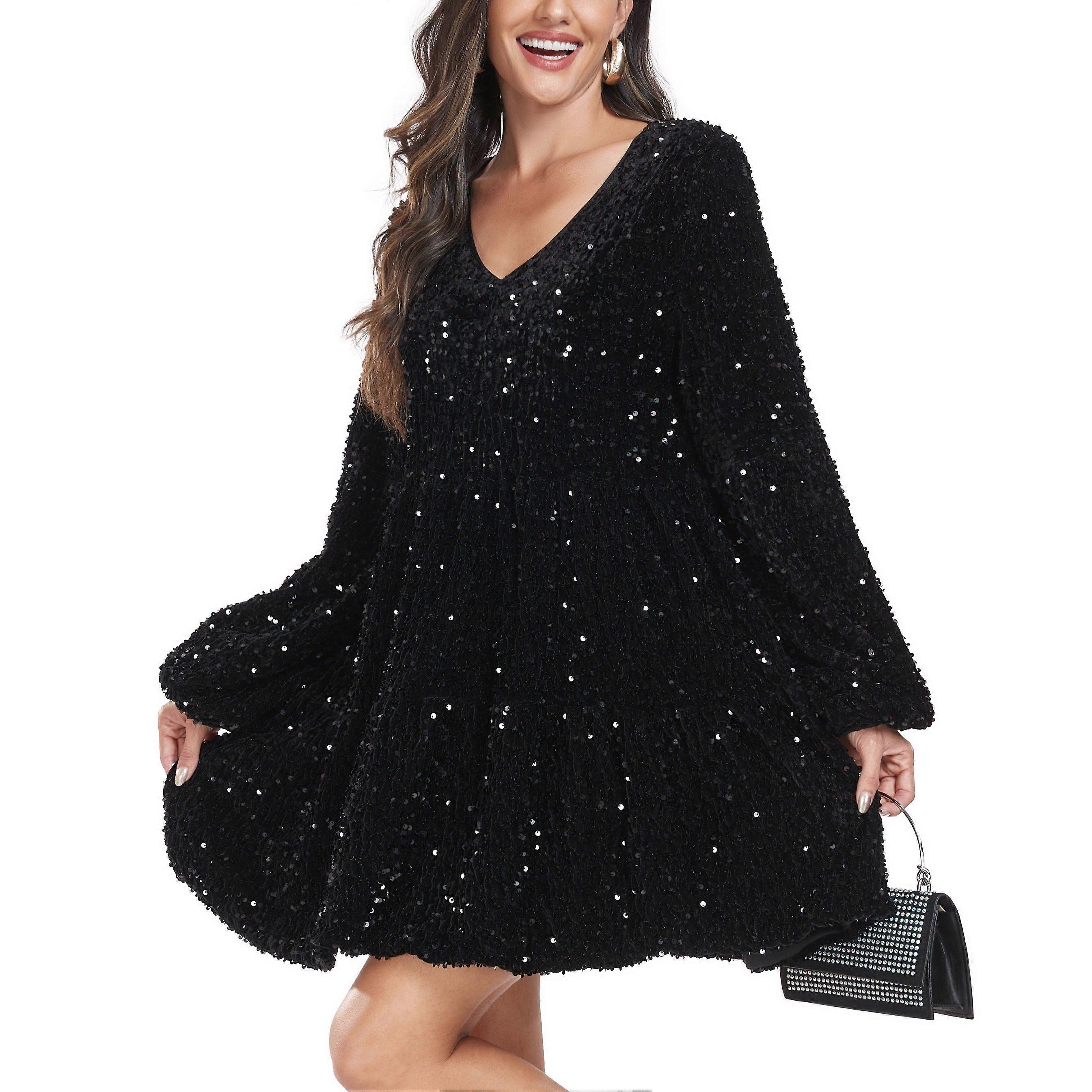 JUNGE Contrast Sequin Mini Dress, Elegant V Neck Long Sleeve Party Dress, Women's Clothing SZJG240306