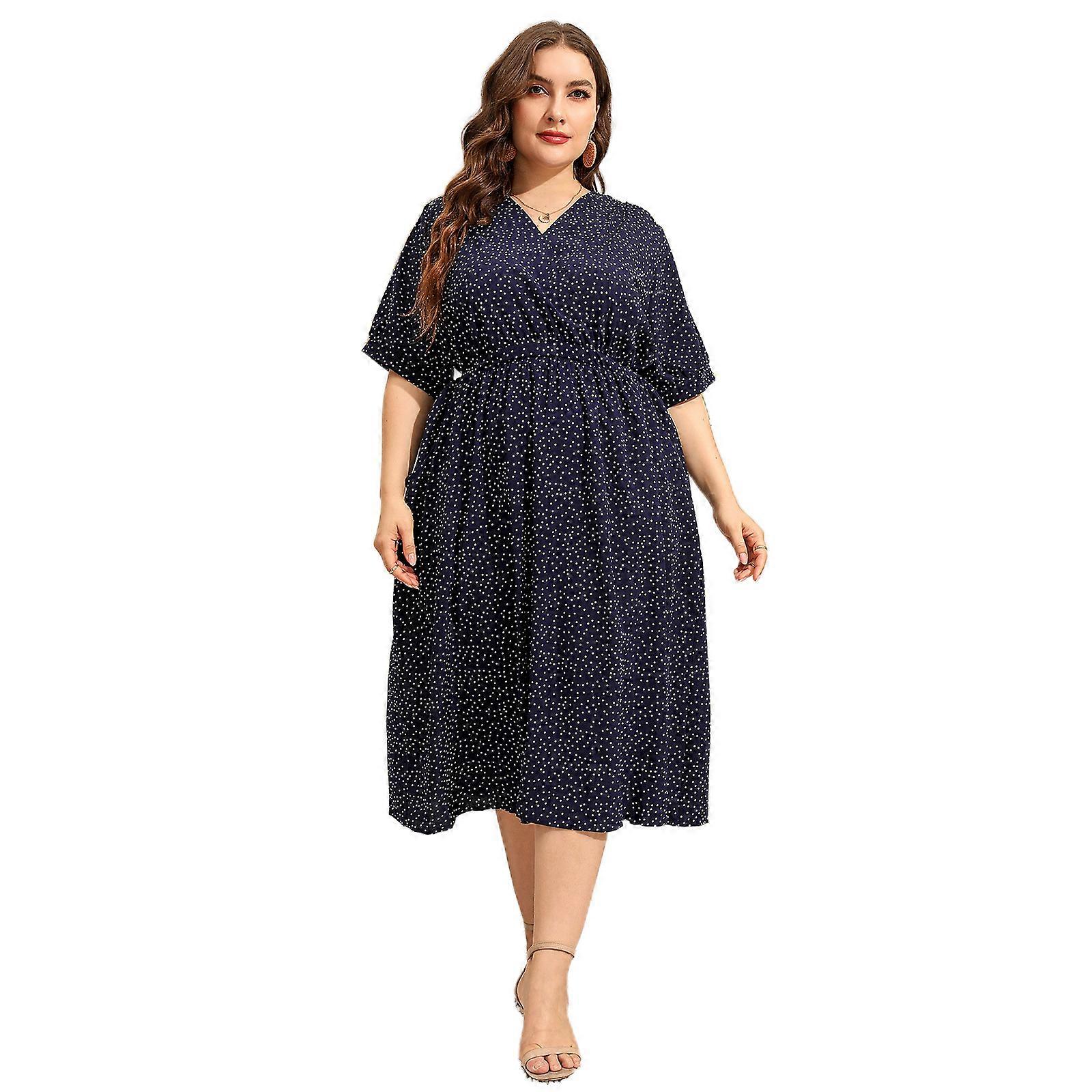 Vintage Casual Midi Dress Women Plus Size Flowy Large Hem V Neck Short Sleeve High Waist Dress for Summer Cocktail Party Deep blue 5XL