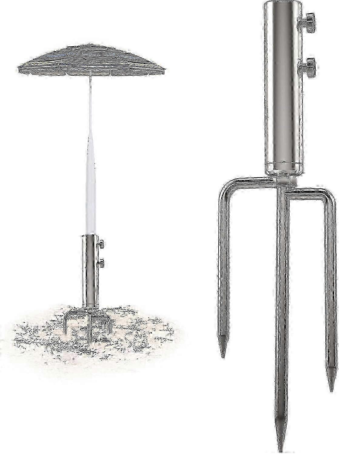 Umbrella Stand Anchor with 3 Spikes, Heavy Duty Metal Parasol Base, Outdoor Umbrella Steel Anchor for Beach Grass SandSturdy and durableThe umbrella stand is equipped with 3 legs, which makes it more stable and stronger than a normal 1 or 2 leg umbrella stand. The umbrella stand is made from high quality tough and reinforced industrial grade material for long life, it will not be subject to environmental erosion like ordinary plastic umbrella stands. Sturdiness and durability are the biggest advantages. Product SizeThe silver umbrella stand anchor is 36cm long, the ground anchor is 20cm long, the mounting tube is 16cm long and the mounting tube hole is 3cm long. The fastening screw can adjust the size of the diameter. It is removable, the top tube and the bottom ground anchor can be detached for easy storage and portability. MaterialThe umbrella ground anchor is made of heavy duty, high quality metal with a galvanised finish to protect against rust. The threaded adjustment screws are also made of high quality steel, which are not easily damaged and provide good tightness. Less damageCompared to other umbrella stands with their own drill, our parasol base leave fewer marks on the lawn - just a few small, unnoticeable holes and no brown marks on the lawn. This means the umbrella stand holder can stay in one place for a longer period of time without damaging the lawn. Scope of applicationThe parasol stand holder can be used on beaches, lawns and land. It is suitable for umbrella poles with a diameter of less than 3cm. It is suitable for garden umbrellas, swinging drying poles, bird feeding poles, flag poles, string light poles, ball poles, outdoor Christmas trees etc. Note: Due to the light and screen setting difference, the item's color may be slightly different from the pictures. Please allow slight dimension difference due to different manual measurement.