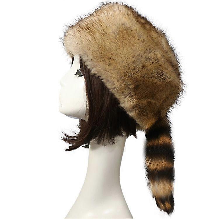 Winter Hat Faux Fur Raccoon Tail Russian Round Flat Top Ear Protection Thickened Autumn Winter Thermal Women Cap Compatible With Camping, One Size
