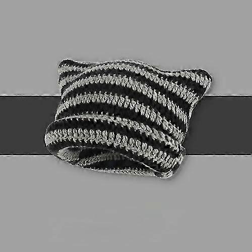 Striped Beanie with Cat Ear Women Contrast Cute Devil Horns Hat Girls Handmade Crochet Winter Warm Ski Cap For Halloween Gift