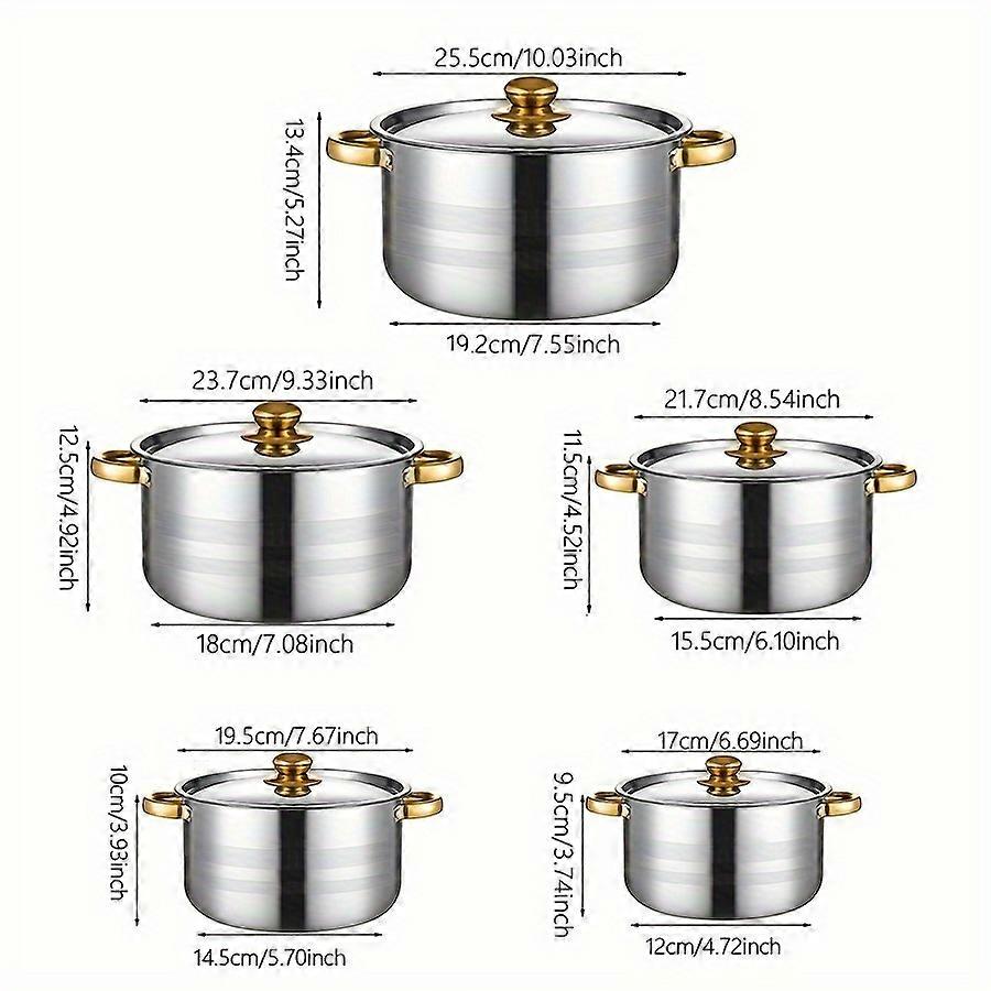 Stainless steel cooking pot, 5 pots+5 lids, stainless steel double handle with lid, deep soup pot, suitable for home and restaur