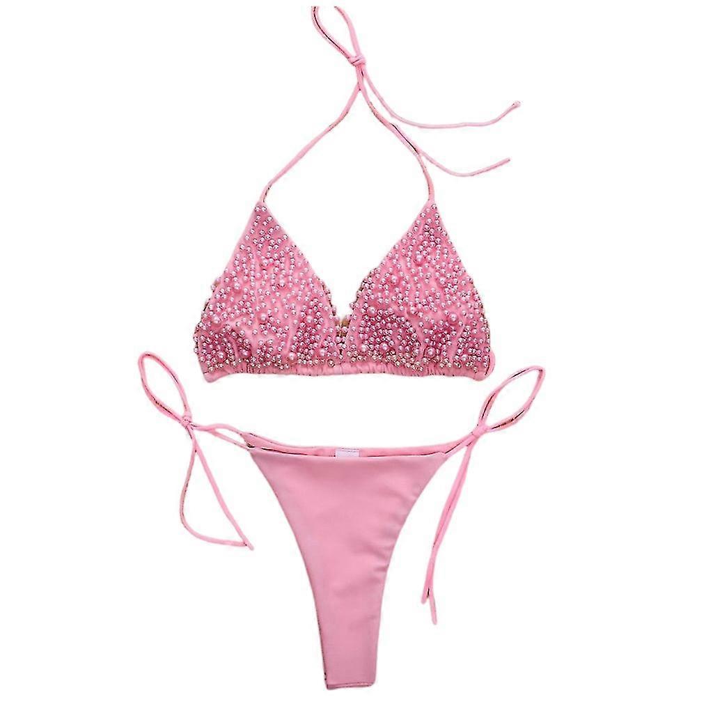 Two Pieces Tie Side Bikinis Set Pearls Swimsuit Lace Up Bathing Suit For Women