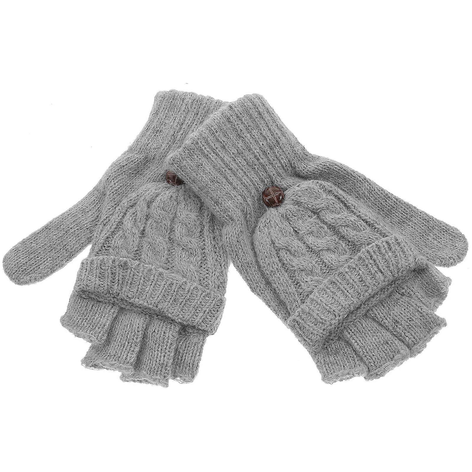 Women Winter Warm Wool Knitted Convertible Fingerless Gloves With Mitten Cover (Grey)