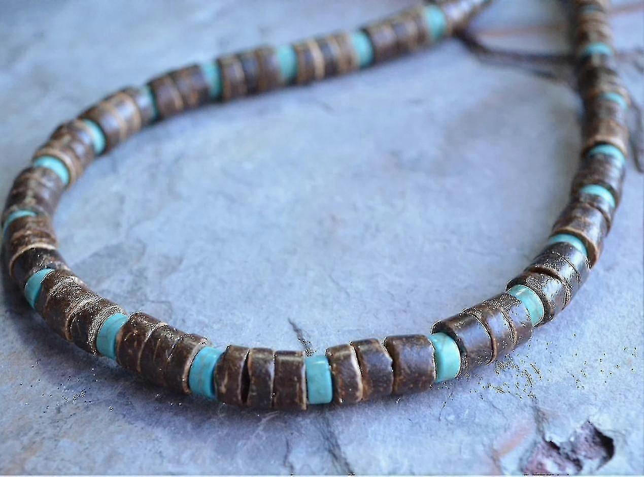 Men Necklace Natural Coconut Pearls, Heishi Pearls In White Natural Shell And Black Wood Beaded Surfer Necklace