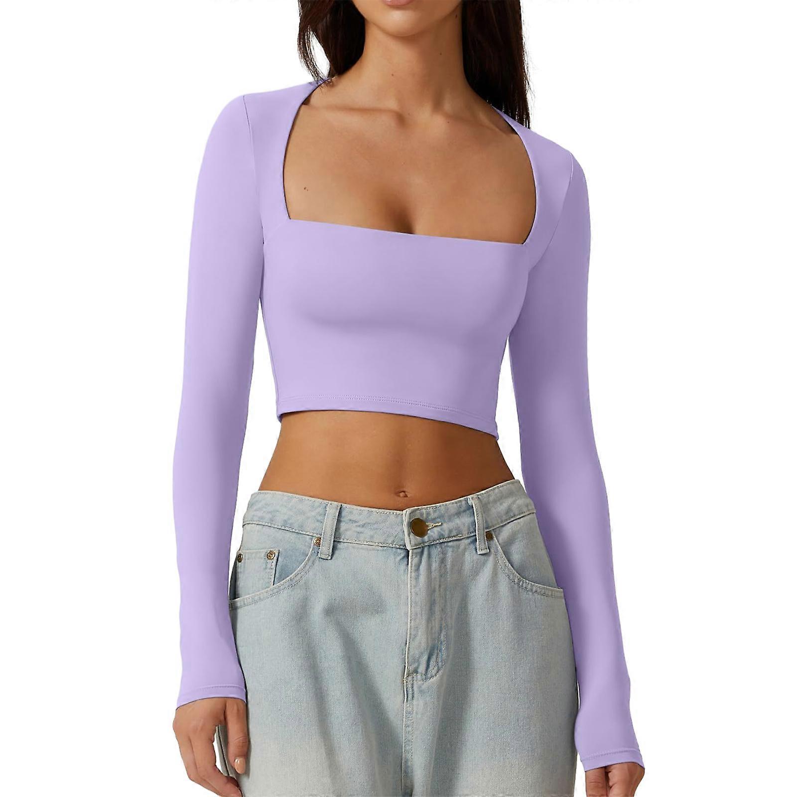 Crop Tops for Womens Square Neck Long Sleeve Tops Solid Color Tops Skinny Blouses Sexy Tops for Party Club Purple XL