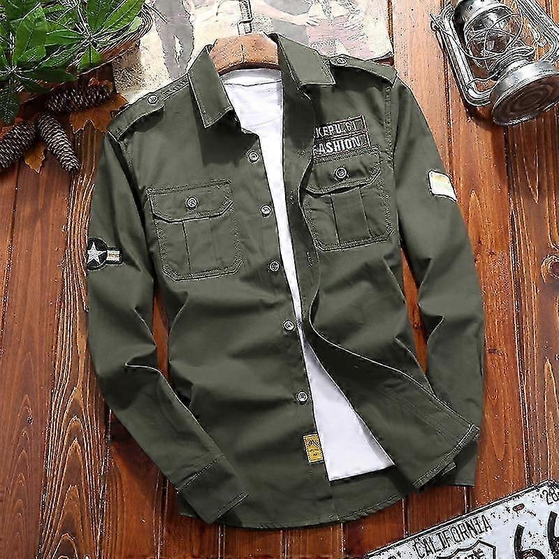 Men's Long Sleeve Cotton Shirt Vintage Army Green Slim Fit Jacket for Spring and Autumn