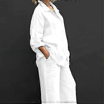 قميص كاجوال من الكتان للنساء 2 قطعة مجموعة طية صدر السترة طية صدر السترة كم طويل زر بلوزة وبنطلون ملابس فضفاضة واسعة الساق السراويل بدلات