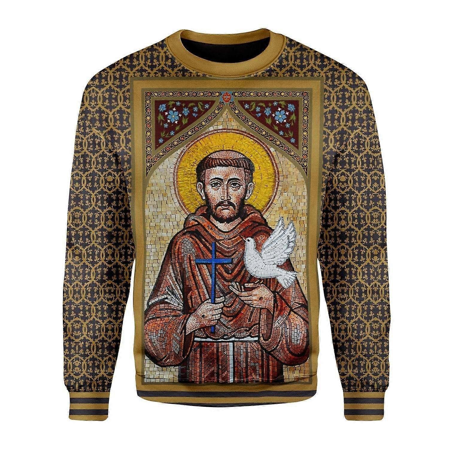 This men's sweatshirt features a detailed mosaic-style image of St. Francis of Assisi, holding a dove and a cross a powerful symbol of peace, compassion, and faith. With intricate baroque-style patterns on the sleeves and background, this piece blends spiritual art with contemporary fashion. Material: Soft, breathable polyester blend for all-day comfort Fit: Regular fit with ribbed cuffs and hem Design: High-resolution print of St. Francis with a radiant halo and ornate frame Ideal for: Religious holidays, daily wear, church gatherings, or as a unique gift Sizes: S, M, L, XL, XXL, XXXL Comfortable fit with soft fabricPerfect for daily wear, events, or themed partiesAvailable in multiple sizes and vibrant colors Comfortable fit with soft fabricPerfect for daily wear, events, or themed partiesAvailable in multiple sizes and vibrant colors