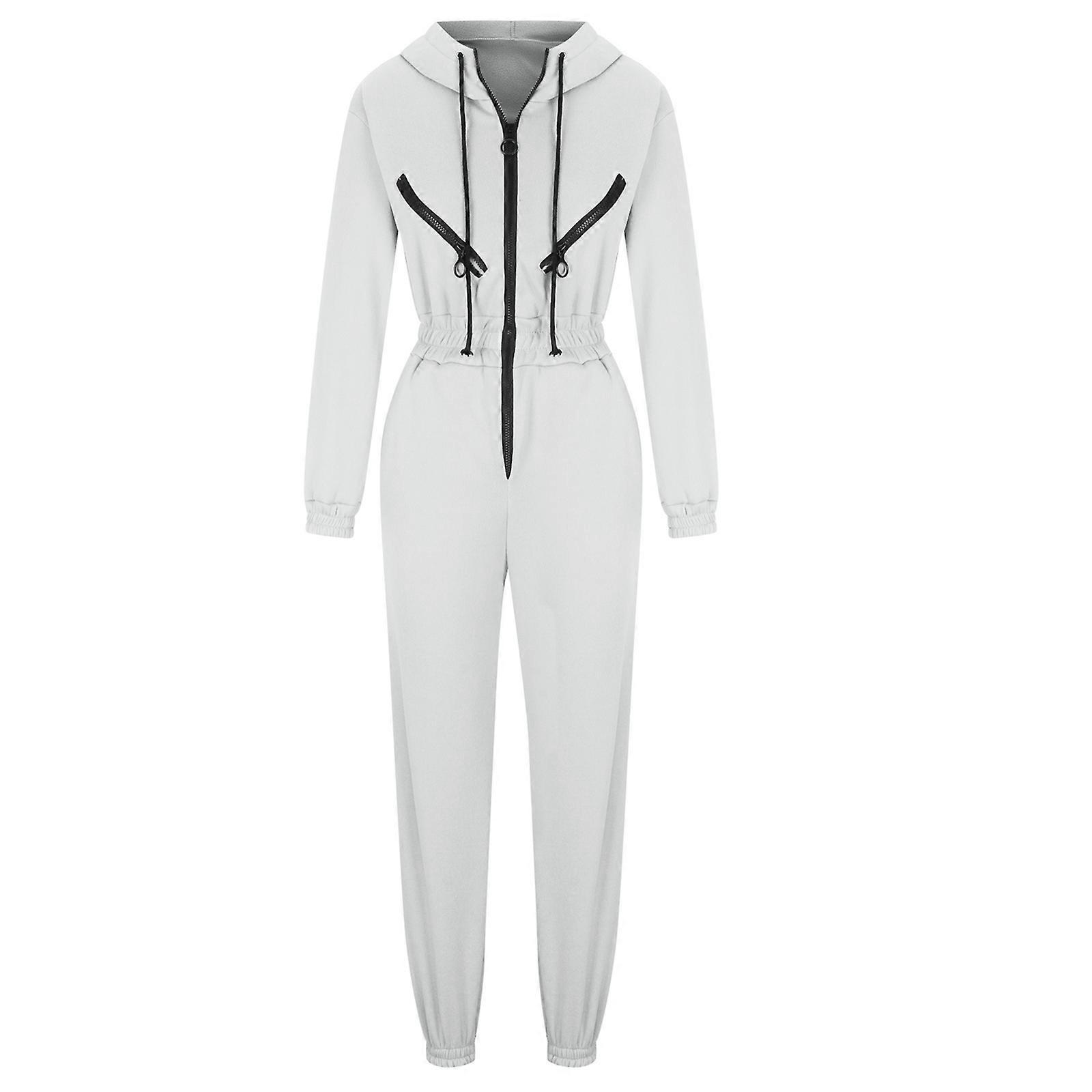 Casual Hoodies Jumpsuits for Women One Piece Outfit Romper Tracksuit Zip-up Hoodies Pullover Jumpsuit with Pockets White XL