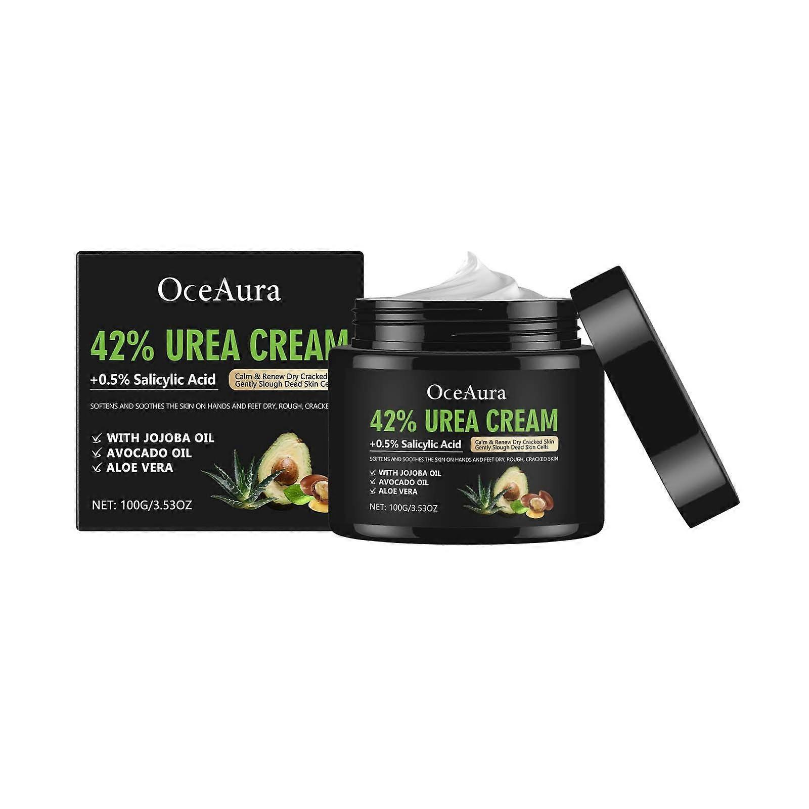 UREA CREAM 42 PERCENT FOR FEET This lotion with urea contains 42% urea known to help soften dry, rough skin. It is great as a callous cream, athletes foot cream, dry foot cream and foot cream for dry cracked heels and feet. FOOT REPAIR CREAM Our urea cream formula is made with chosen ingredients such as Jojoba Oil, Avocado Oil and Aloe Vera renowned for their skin benefits and moisturizing properties to help refresh the skin. 0.5 PERCENT SALICYLIC ACID Our urea foot cream contains urea and salicylic acid, renowned for helping soften and improve the appearance of dead skin cells, rough dry hard skin, corns and callouses of the feet. DEEPLY MOISTURIZING CREAM 42% urea cream for feet can deeply penetrate the skin and help retain moisture. This makes it truly a must-have for dry cracked feet care. HAND & FOOT CARE Urea moisturizer hydrates and softens dry, cracked and rough skin. It is an awesome foot care cream for men and women to help exfoliate and remove dead skin cells.