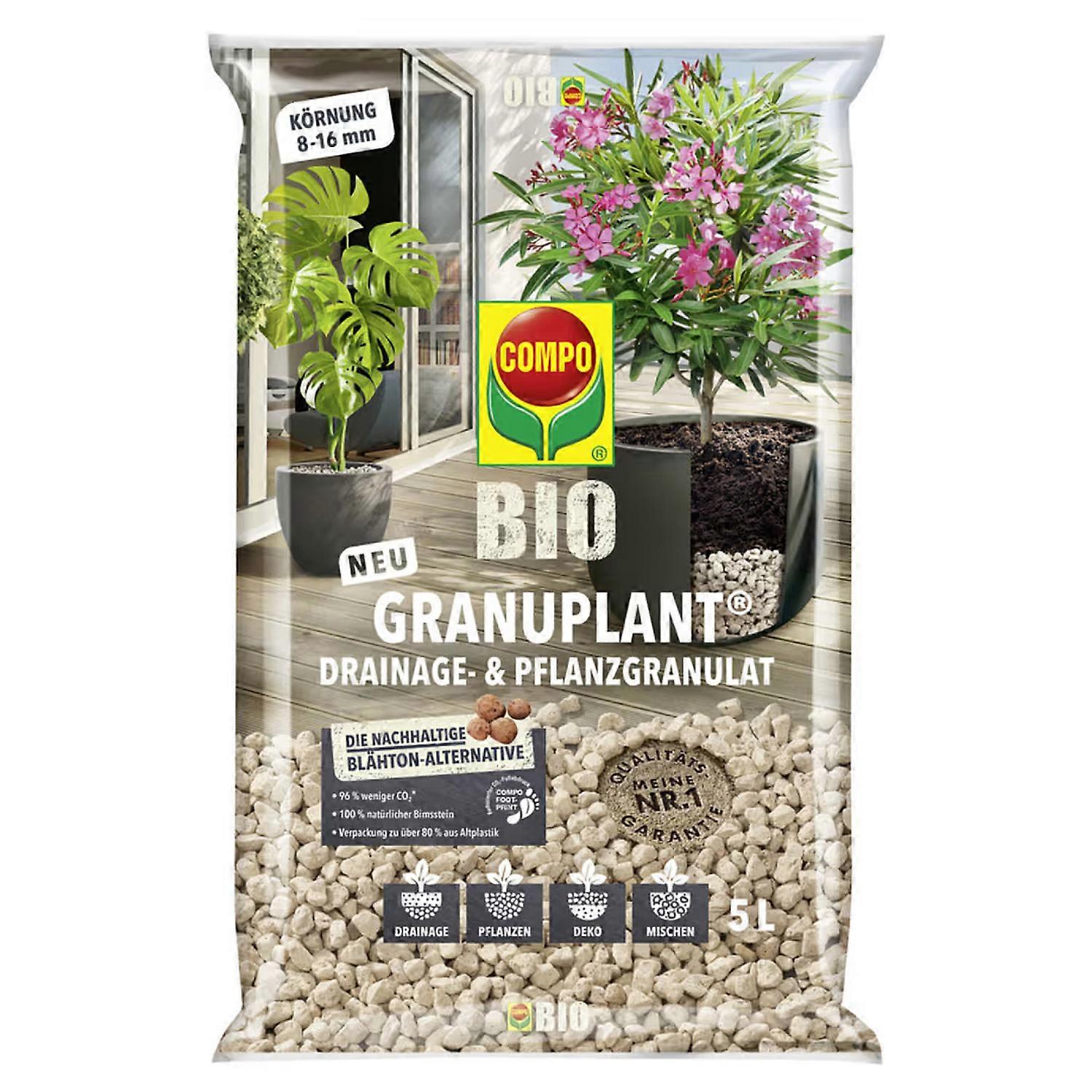 Produktbeschreibung:COMPO BIO GRANUPLANT® Drainage- und Pflanzgranulat: die nachhaltige Alternative zum herkömmlichen Blähton. 100 % naturbelassen: natürliches Bimsgranulat aus Rheinland-Pfalz. 96% weniger CO₂ als herkömmlicher Blähton (die Berechnung erfolgt in CO₂-Äquivalenten auf der Basis von Durchschnittswerten aus anerkannten Datenbanken). Eignet sich hervorragend als Drainageschicht in jedem Pflanzgefäß und schützt Pflanzen so vor Staunässe und Wurzelfäule. Das ideale Pflanzmedium für Hydro- und Semikulturen. Sorgt für eine optimale Bodenbelüftung und leitet Wasser sehr effektiv kapillar an die Wurzeln. Untermischen des Bimsgranulats lockert die Erde auf und schützt vor Verdichtung. Optisch ansprechende Erdabdeckung von Pflanzgefäßen: verhindert das Austrocknen der Erde. Hohe Strukturstabilität und extrem lange Haltbarkeit. Sofort anwendungsfertig: muss im Gegensatz zu Blähton vorab nicht gewaschen werden. Verpackung besteht aus > 80 % PCR-Kunststoffrezyklat mit Blauem Engel.Anwendung:für: Eigenschaften: hochwertiges, 100 % natürliches Bimsgranulat als nachhaltige Alternative zu herkömmlichem Blähton: 96 % weniger CO₂die ideale Drainageschicht in allen Pflanzgefäßen um Staunässe und Wurzelfäule zu verhindernbestens geeignet als Pflanzsubstrat für Hydro- und Semikulturendas Abdecken der obersten Erdschicht mit GRANUPLANT® schützt die Erde vor dem AustrocknenUntermischen des Bimsgranulats lockert die Erde auf und stellt eine optimale Bodenbelüftung sicherhohe Strukturstabilität und extrem lange HaltbarkeitVerpackung besteht aus > 80 % PCR-Kunststoffrezyklat mit Blauem EngelGebrauchsanweisung:Als DrainageschichtWir empfehlen, das COMPO BIO GRANUPLANT® Drainage- und Pflanzgranulat zu einem Viertel bis einem Drittel als untere Schicht in das Pflanzgefäß einzufüllen. Das restliche Gefäß je nach Pflanzenart mit einer COMPO BIO oder COMPO SANA® Blumenerde auffüllen.Als Pflanzmedium für Hydro- und SemikulturenGeeignet für Pflanzen, die über das Jungpflanzen-Stadium hinausgewachsen sind.Vorbereitung: Bei einer Pflanze, die in Erde gezogen wurde, die lockere Erde vorsichtig abschütteln. Den dicht durchwurzelten Erdballen so belassen, um eine Verletzung der Wurzeln zu vermeiden. Wurde die Pflanze in einer Hydrokultur gezogen, die Wurzeln zunächst behutsam vom alten Substrat befreien. Einen zuvor benutzten Topf vor dem Bepflanzen gründlich reinigen.Einpflanzen: Den Topf zu einem Viertel mit dem COMPO BIO GRANUPLANT® Drainage- und Pflanzgranulat befüllen. Die Pflanze in den Topf setzen und zur Stabilisierung weiteres Granulat um die Pflanze herum einfüllen.Düngen: Die Pflanze mit einer gering dosierten Nährlösung gießen. Den COMPO COMPLETE Pflanzendünger mit halber Dosis aber dafür doppelt so oft verwenden.Hinweis: Es ist darauf zu achten, dass bei Maximal-Wasserstand der Wurzelballen nicht im Wasser steht. Es empfiehlt sich die Verwendung eines Wasserstandanzeigers.Als Abdeckung der obersten Erdschicht im PflanzgefäßAls oberste Schicht im Pflanzgefäß empfehlen wir, eine 2-3 cm dicke Schicht des COMPO BIO GRANUPLANT® Drainage- und Pflanzgranulats gleichmäßig auf der Erde zu verteilen.Als ErdmischungFür Pflanzen, die empfindlich auf Staunässe reagieren, empfehlen wir, der Erde bis zu 25 % des COMPO BIO GRANUPLANT® Drainage- und Pflanzgranulats beizumischen.Anwendungszeitraum: Februar bis NovemberWirkstoffe / Inhaltsstoffe: 100 % naturbelassen: natürliches Bimsgranulat aus Rheinland-Pfalz Packungsgröße: 15 Liter Beutel