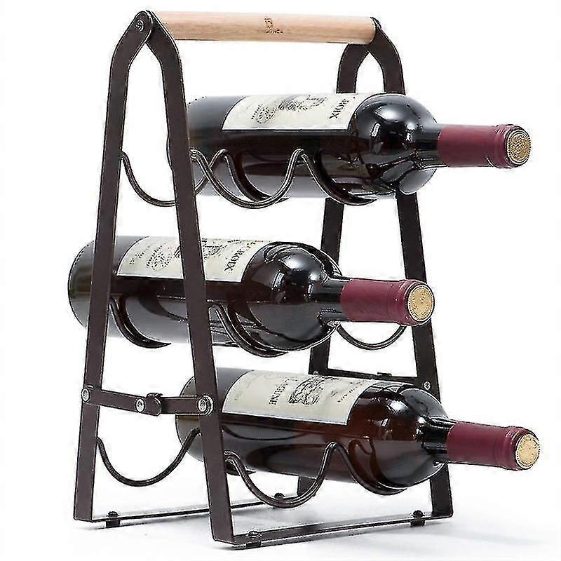 Countertop Wine Rack, Tabletop Wood Wine Holder for 6 Bottle Wine, 3-Tier Classic Design, Wood & Metal Wine Holding Rack play rack can store 6 bottles when it's unfolded. STURDY & STYLISH - This elegant wine rack is made from high-quality metal and designed with a secure structure, which prevents wobbling, tilting, or falling. COMPARABLE & DECORATIVE - Easy and comparable wine display rack fits anywhere, countertop, bar, kitchen cabinet, tabletop, or any matches decorative space without occupying extra space. Feature: storage 6 bottles of wine iron + wood design looks more fashion Foldable Material: iron Size about:14.4*8*7.9 inch(H*L*W). Usage: for Home Decor, Bar, Wine Cellar, Basement, Cabinet The small wine rack with a compact kit and foldable design can be displayed anywhere without taking up additional space and folded for easy storage. It's ideal for keeping your favorite bottles organized, and it also coordinates beautifully with almost any countertop, tabletop, bar, shelf, kitchen cabinet, etc. PACK*1PCS.