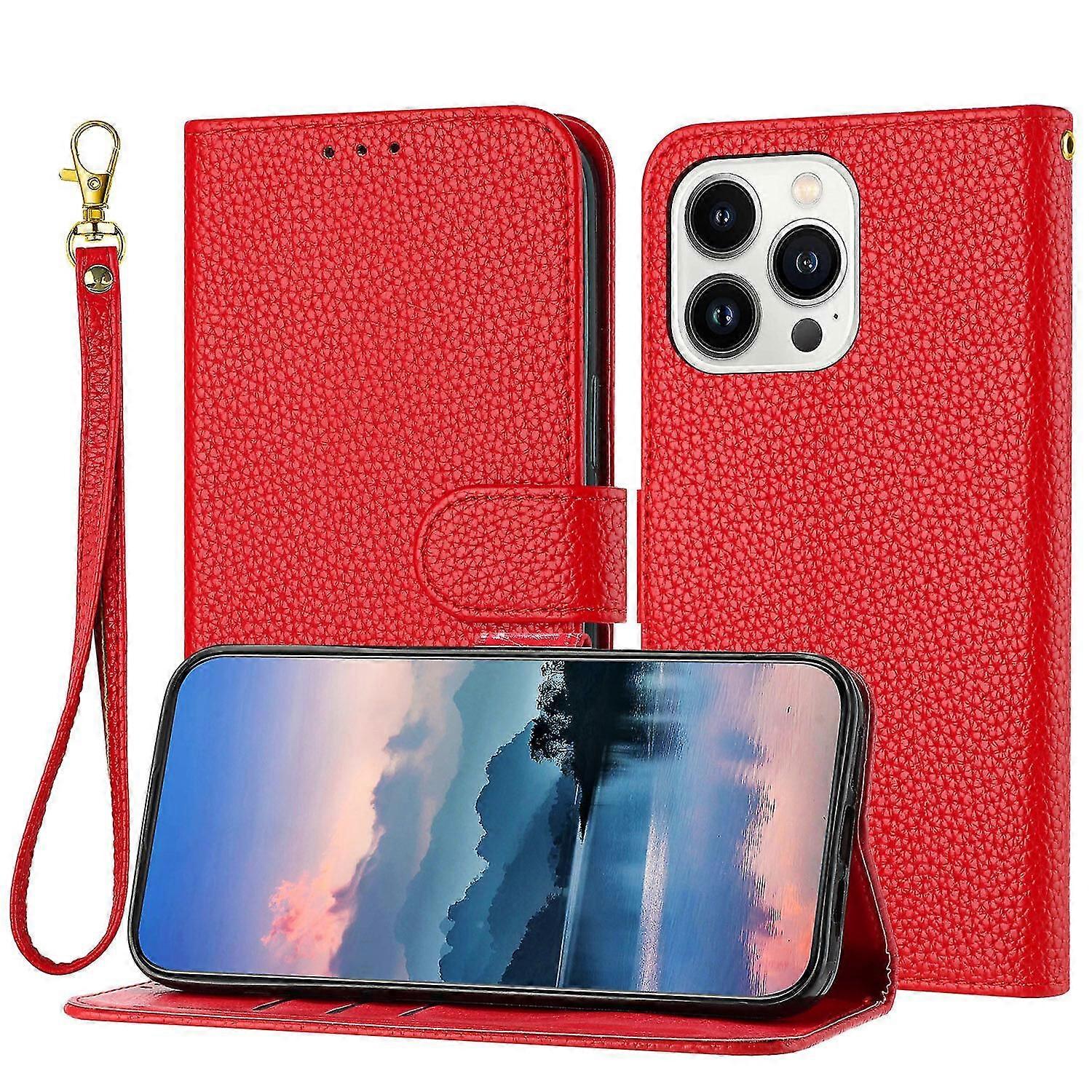 For iphone 14 pro max Case, Litchi Grain PU Leather Folio Cover Magnetic Closure Flip Wallet Card Slots Stand Case With Hand Strap,Brown
