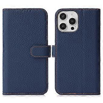 For iPhone 16 Pro Max Stand Case Litchi Texture Genuine Cow Leather Wallet Phone Cover RFID Blocking Blue