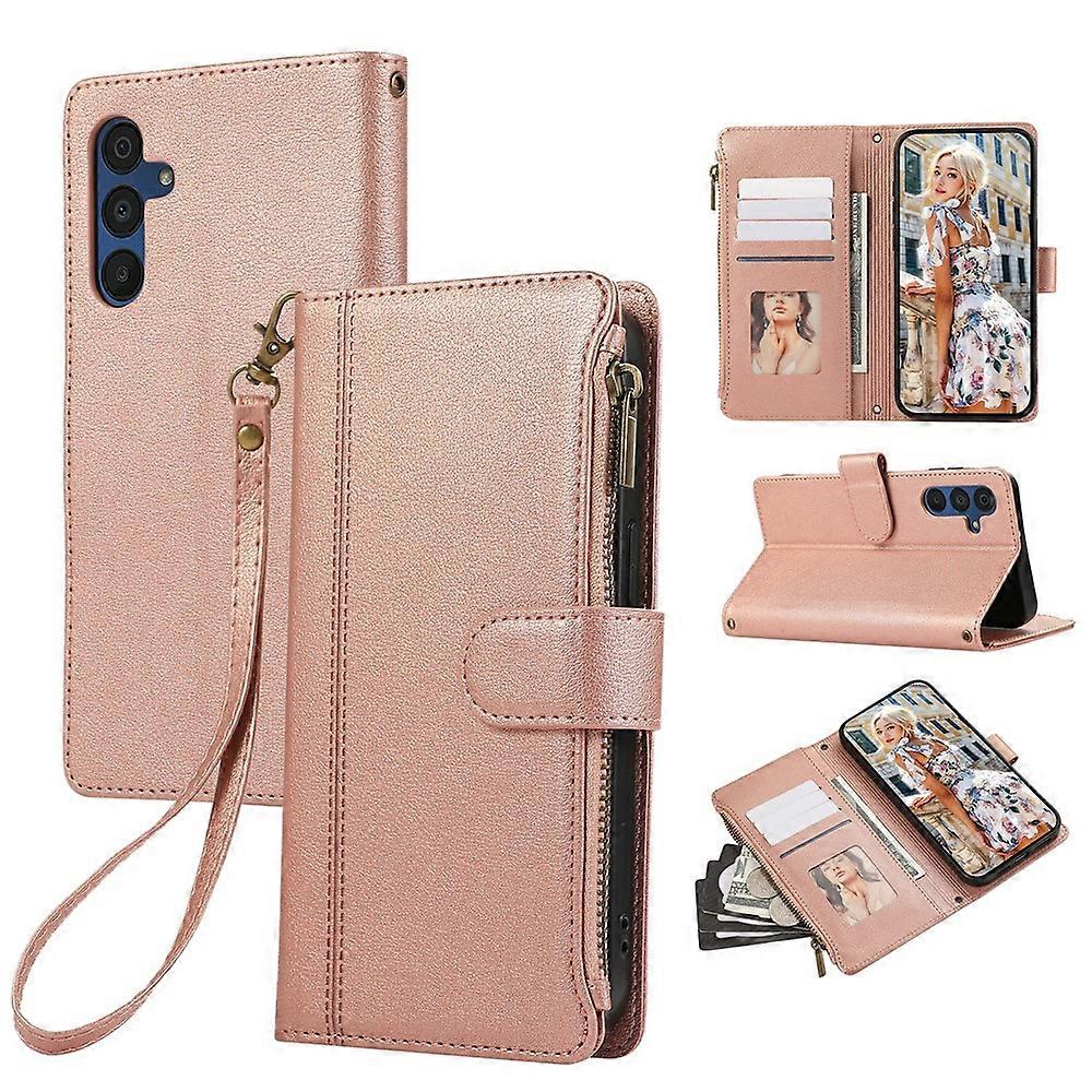 For Samsung Galaxy A25 5G (Global) (161mm) Case Multi Card Slots Zipper Leather Phone Cover with Wrist Strap Rose Gold