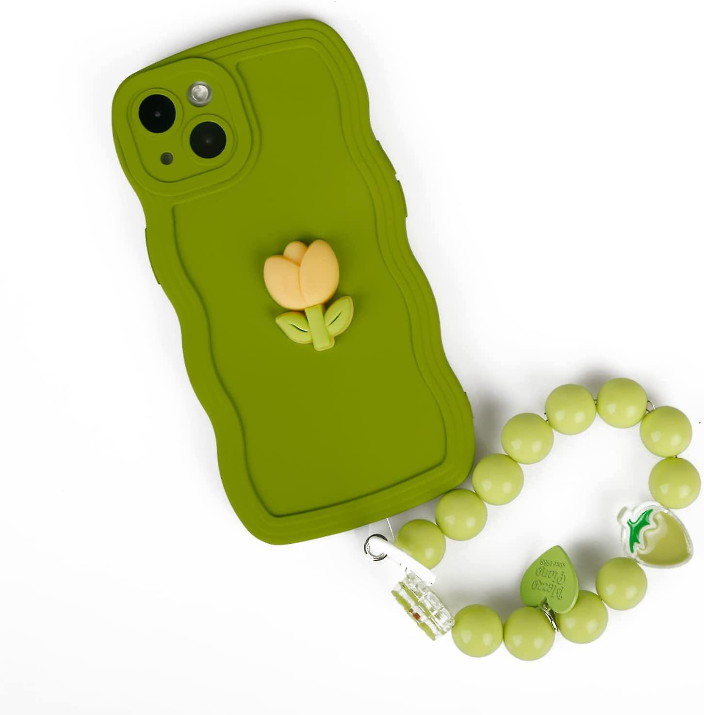 Cute 3D Flower iPhone 14 Case, Unique Lace Wavy Edge Green Floral Tulips Phone Case with Kawaii Strawberry Bracelet Chain for Women, Girl