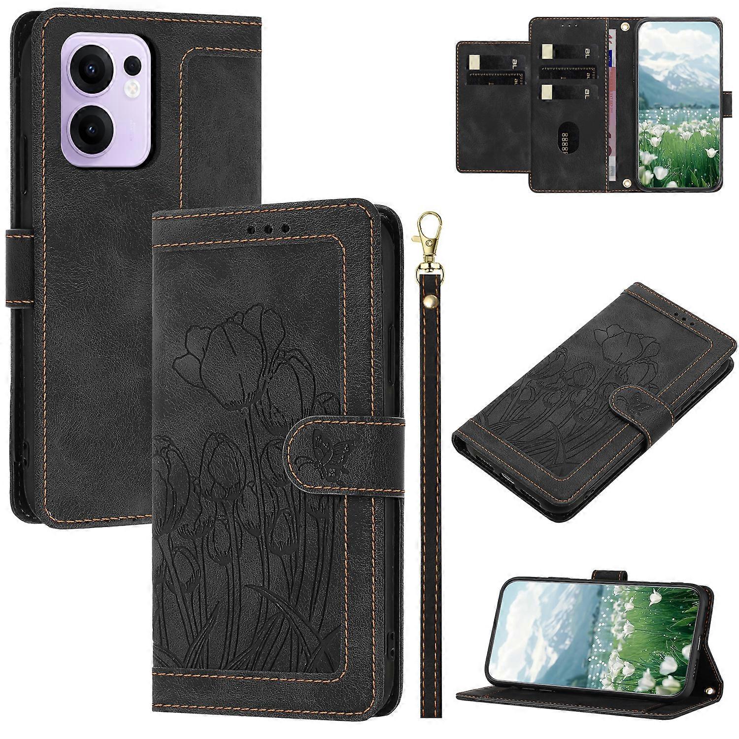 For Oppo Reno13 F 5G 4G Case Tulip Leather Phone Cover with 5 Card Slots Wallet Black