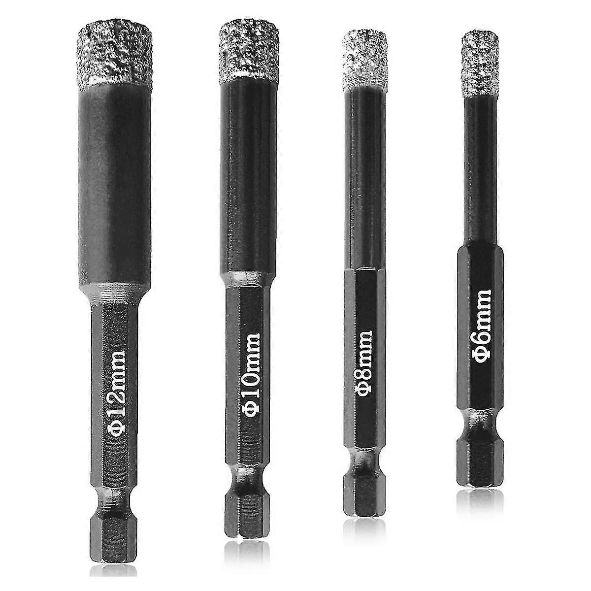 4pc's - dry diamond bit with hexagonal . Dimensions: 1/4 inch (6mm), 5/16 inch (8mm), 3/8 inch (10mm), 1/2 inch (12mm)Application - Diamond bits are designed for use in , , granite, , masonry, concrete, various types of tiles and .Performance - Vacuum brazing diamond technology provides fast, chip-free holes while maintaining a long service life.Tool handle - The quick-change hexagonal tool handle provides better chuck grip and is suitable for different types of drill bits.Self-cooling - diamond bit is combined with wax. Wax melts during drilling, absorbs and dissipates heat, thus achieving dry drilling (water can be added to prolong the service life and harder ).Color: blackMaterial: metalPackage Contents:4 x drill bitsOnly the above package content, other products are not included.Note: Light reflection and different displays may cause the color of the item in the a little different from the real thing. The measurement allowed error is +/- 1-3cm.