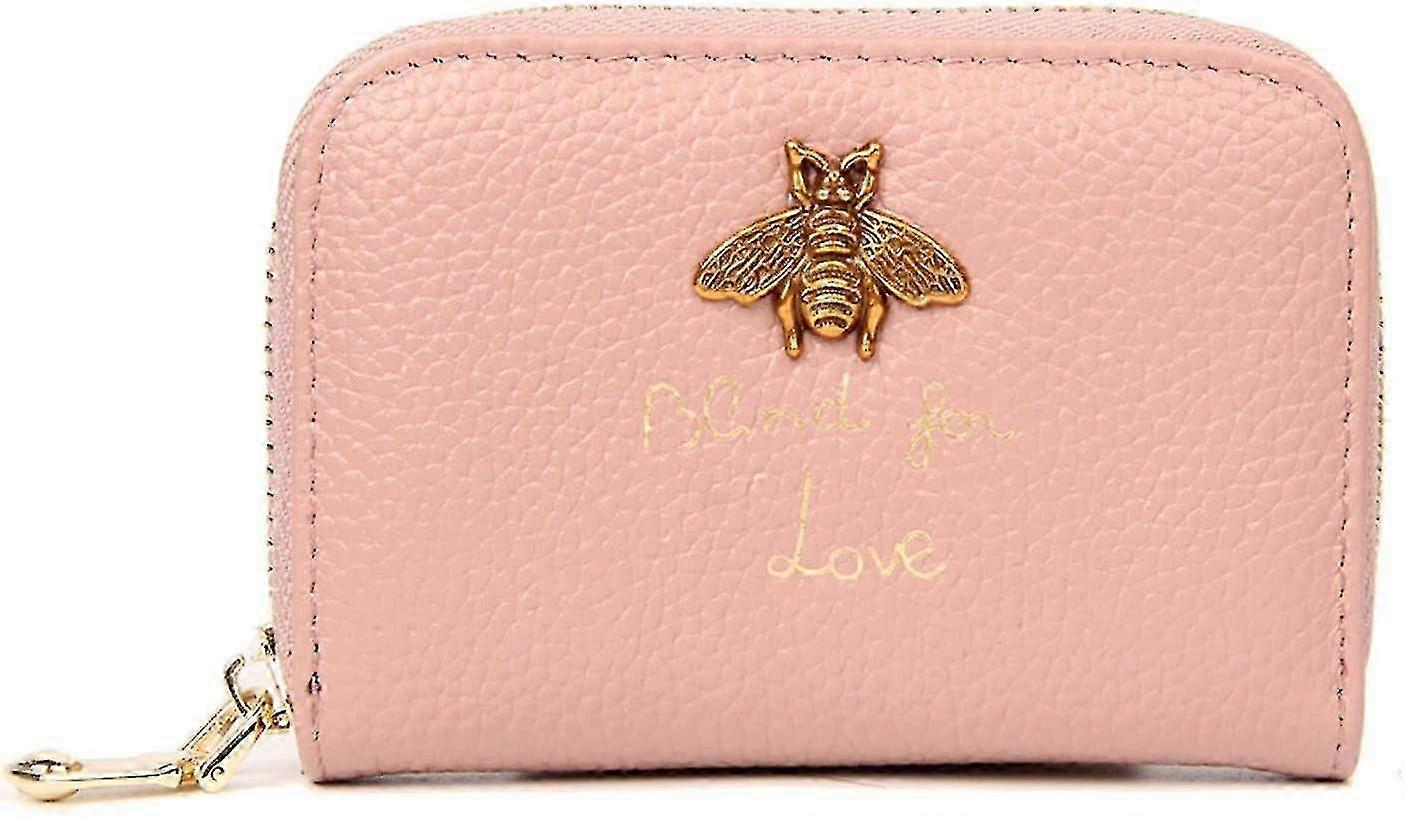 For Women Pink Pu Leather Mini Credit Card Wallet with Zipper & Retro Bee Decoration