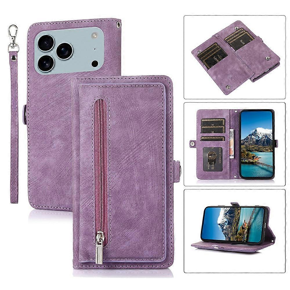 For iPhone 17 Pro Max Case Zipper Pocket 9 Card Slots PU Leather Phone Cover with Wrist Strap Purple
