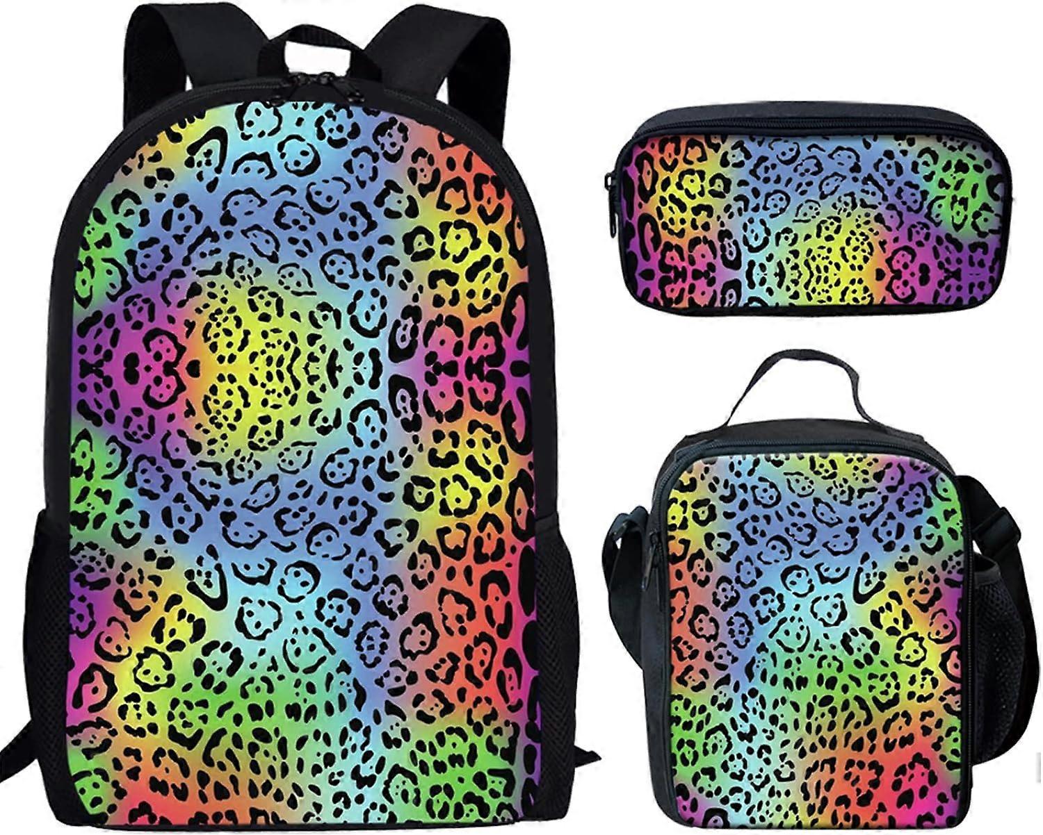 Leopard Rainbow Teenager Girls Backpack Canvas Rucksack School Book Bag with Pencil Case Lunchbox, Cheetah Spot 17 Inch Backpack for Kids Teen Girls S