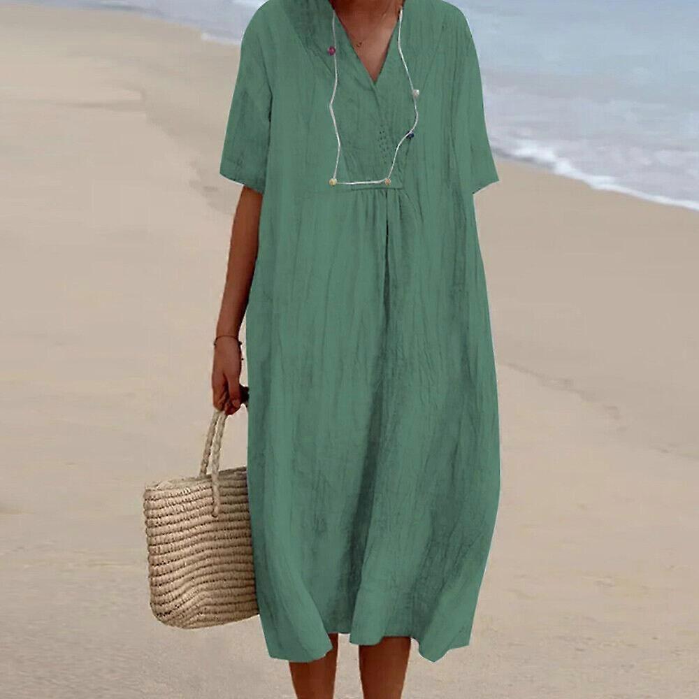 Description Feature: 100% Brand new and high quality Style: fashion,casual Size: S,M,L,XL,2XL Color: light green,blue,green,black,khaki Material: cotton,linen Fabric: cotton blend Sleeve length: half sleeve Thickness: thin Neckline: v-neck Length: maxi Pattern: solid Season: summer Occasion: everyday,daily,beach Garment:Hand washing or machine washing,line dry. Package:1pcs dress Note: 1.Due to the light and screen difference, the item's color may be slightly different from the pictures. Please understand. 2.Please allow 2-3% error due to manual measurement.Please make sure you don's mind before you mid. 3.Size doesn's fit all.Please carefully check size chart and select the size based on your real size.