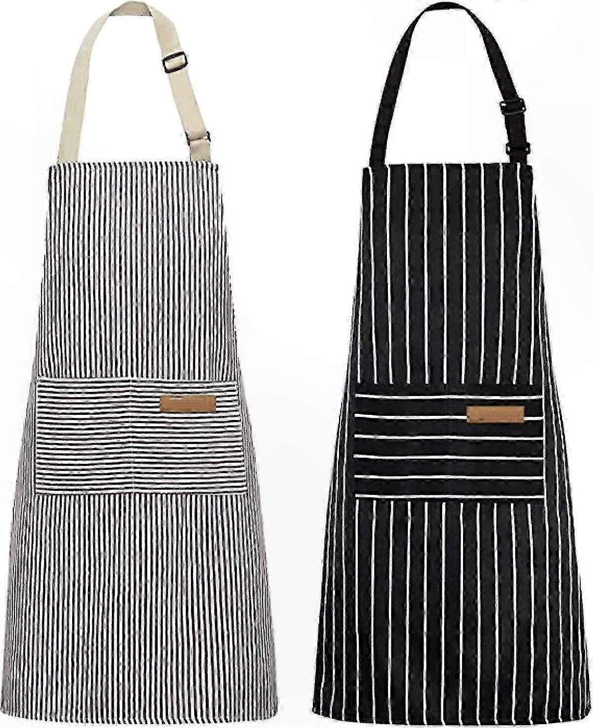 Adjustable Chef Aprons with Pockets, 2-Pack Cooking Aprons for Men and Women (Black/Brown Striped Design)